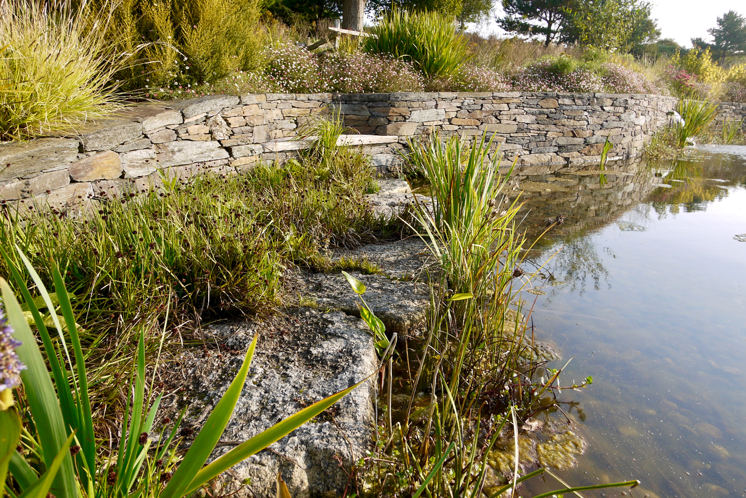 Shallow planting areas act as natural regeneration zones, working in harmony with a low‑power filtration system that removes organic particles and, when needed, provides UV treatment and oxygenation. The result is a beautifully balanced, living water-body that stays clear, healthy, and inviting.