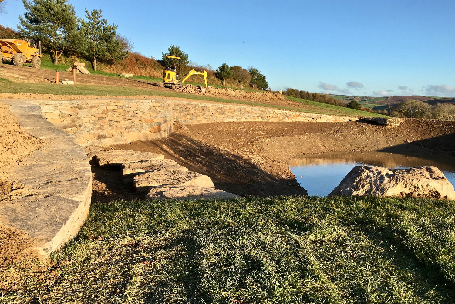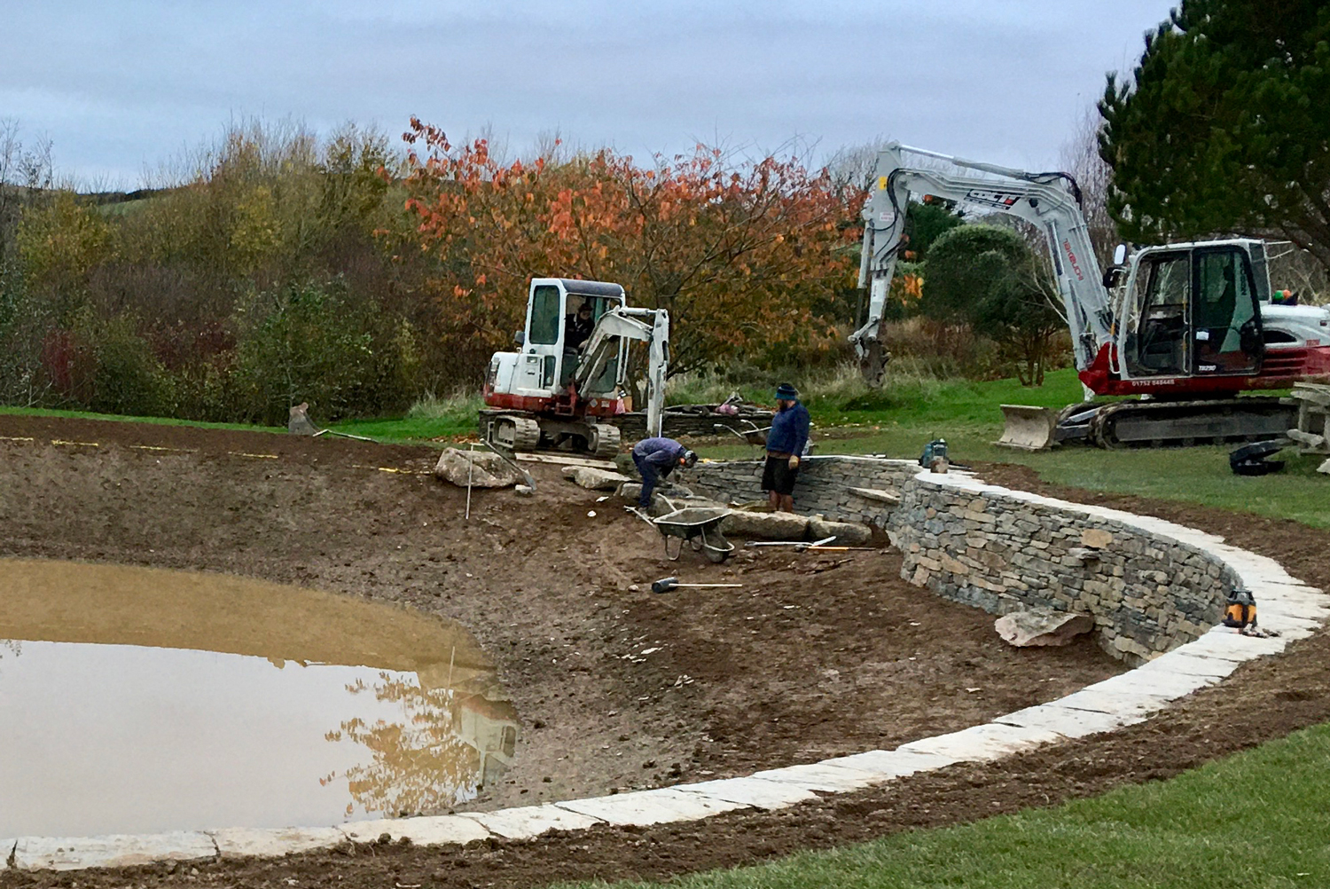 Pond construction on a significantly sloping site is achieved by excavating a margin shelf on the higher side to be retained by a feature stone-wall at water level as part of the design and the construction of a wide dam bund on the lower side, constructed from the excavated material.