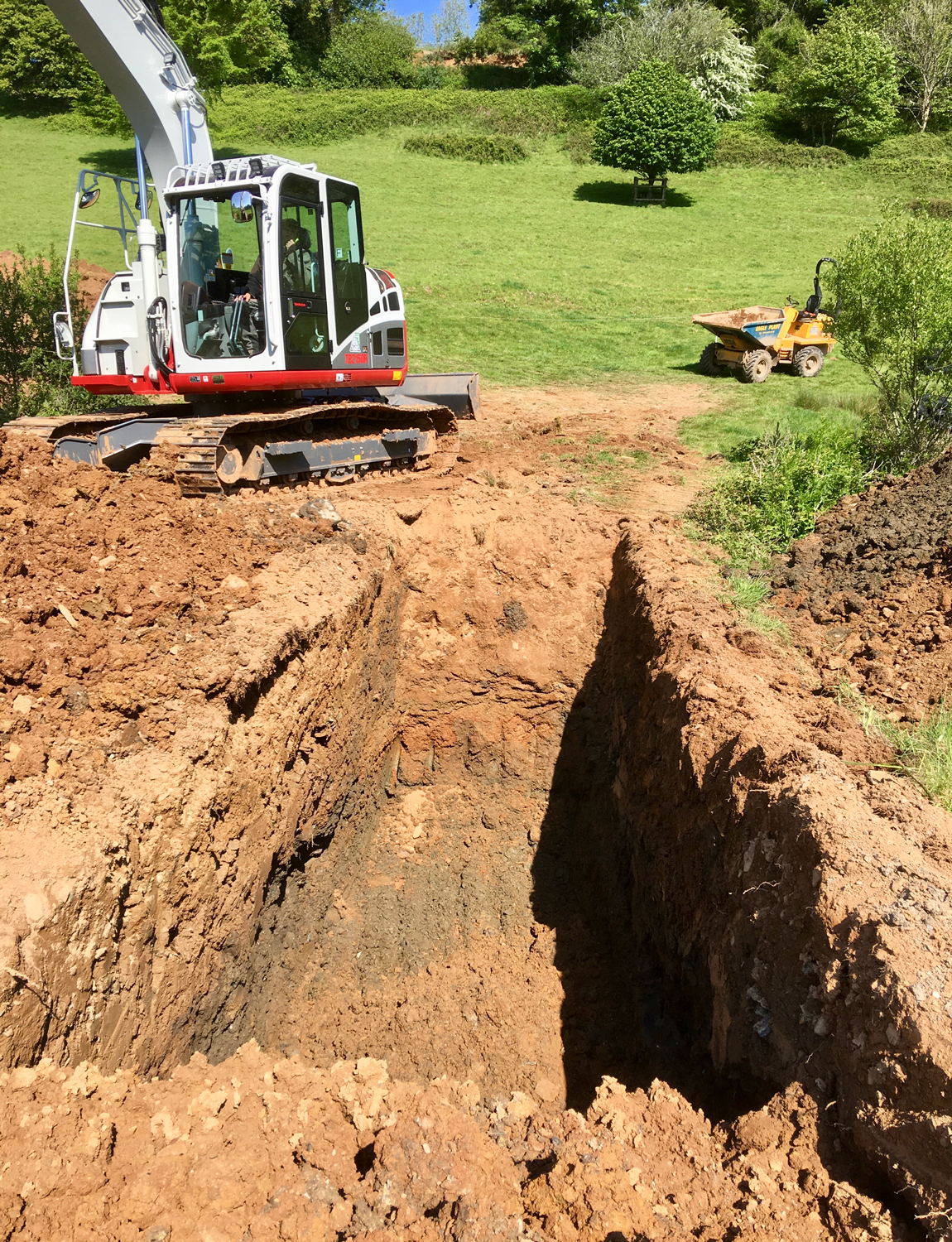 A critical step is the excavation of footings key beneath the bund if there is damming required, such as the typical shallow valley site. This ensures that no historic land drainage is left beneath the dam and removes weak sediment or gavel layers before the best clay rich material is used to construct the bund off the back-filled footing.